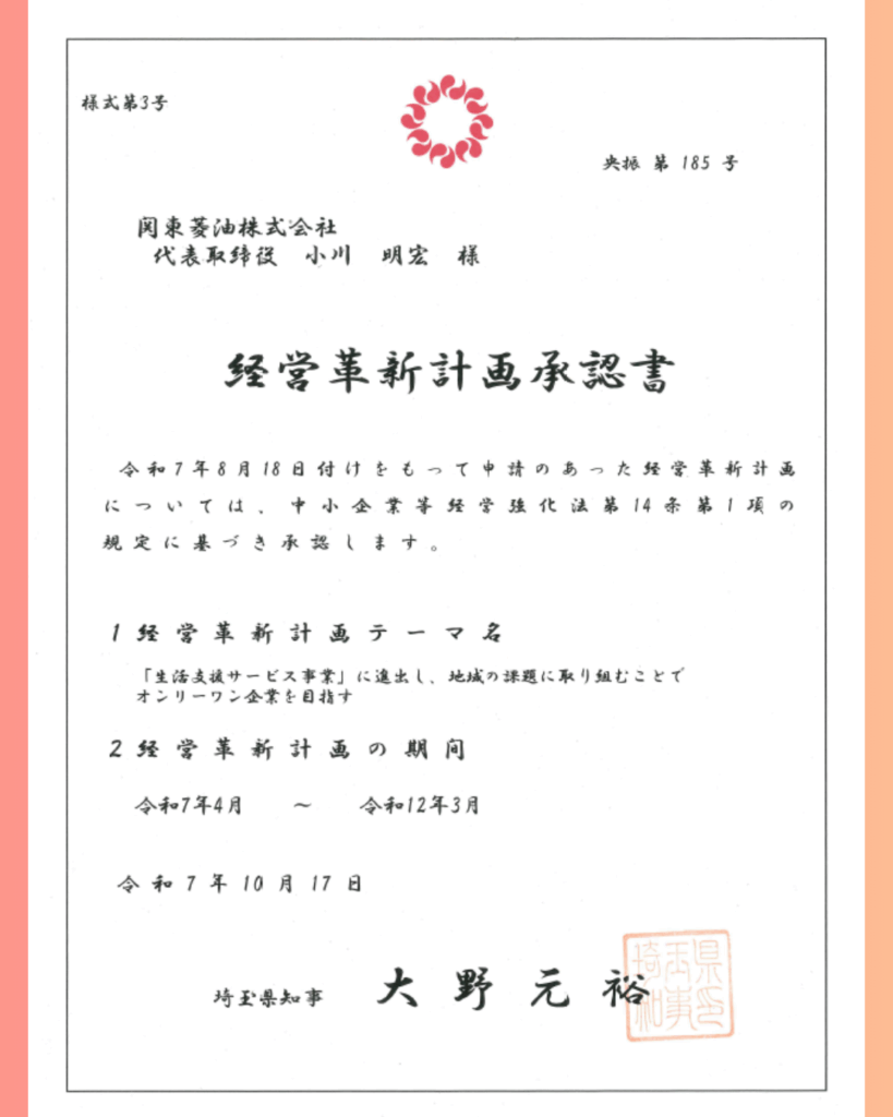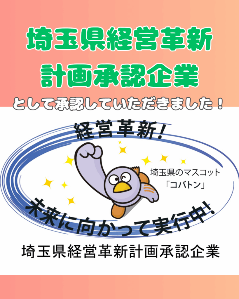 この度、埼玉県より『埼玉県経営革新計画承認企業』として承認をいただきました!